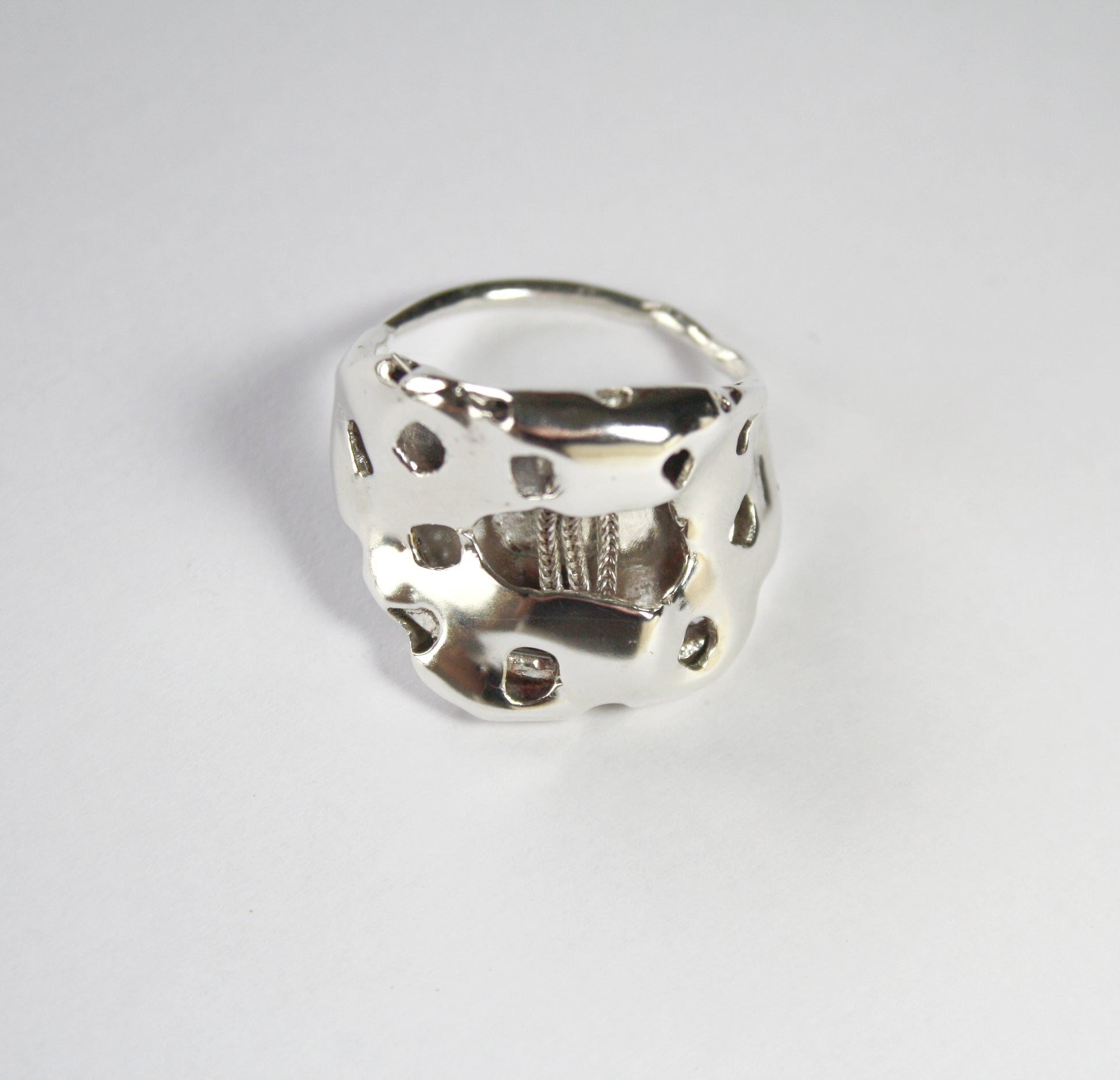 Com formas volumosas e marcantes, este anel é uma homenagem à arquitetura brutalista e às janelas que moldam as nossas cidades. Inspirado na cidade e no seu progresso, ele reflete a dualidade entre o que é sólido e o que é visionário, entre a permanência e a transformação.