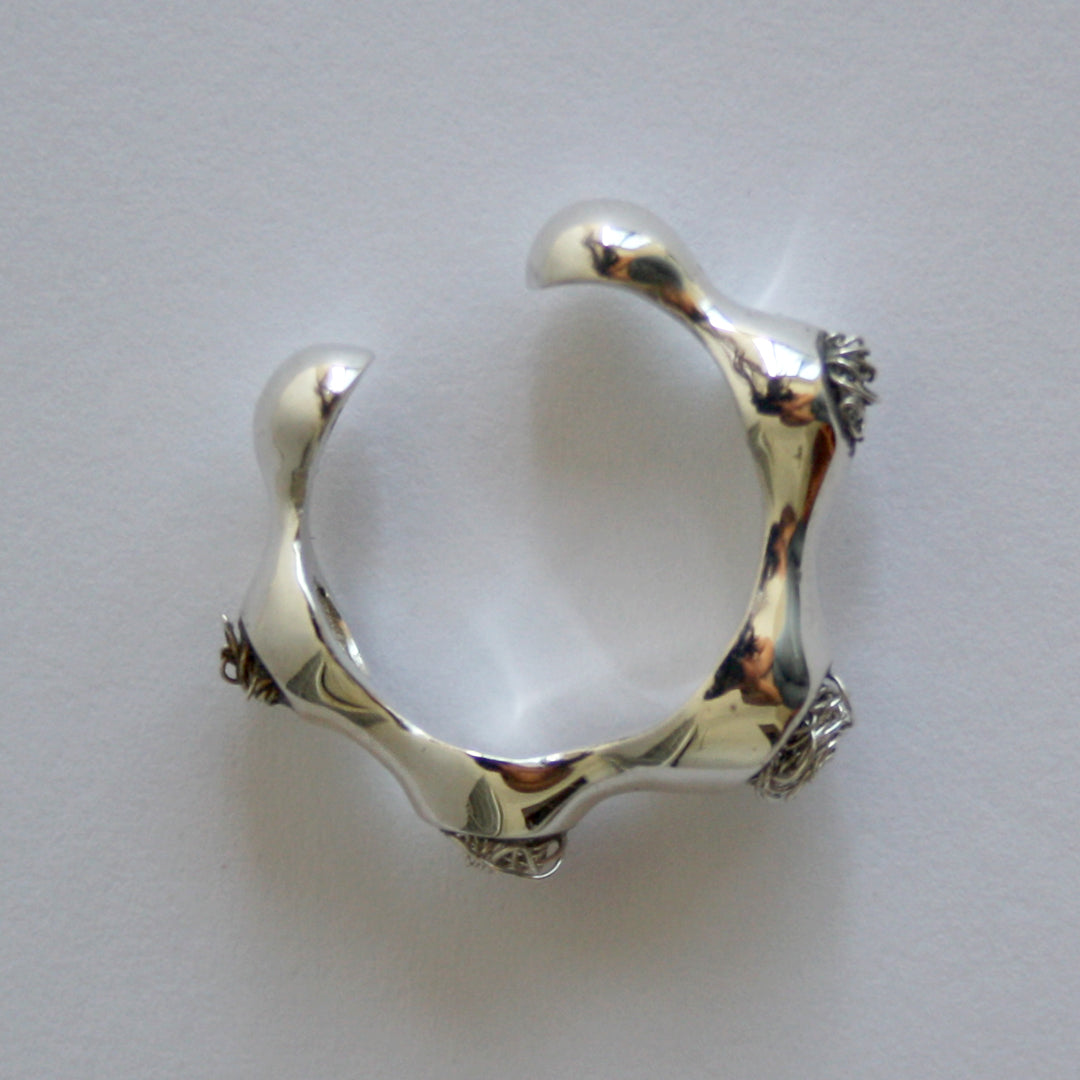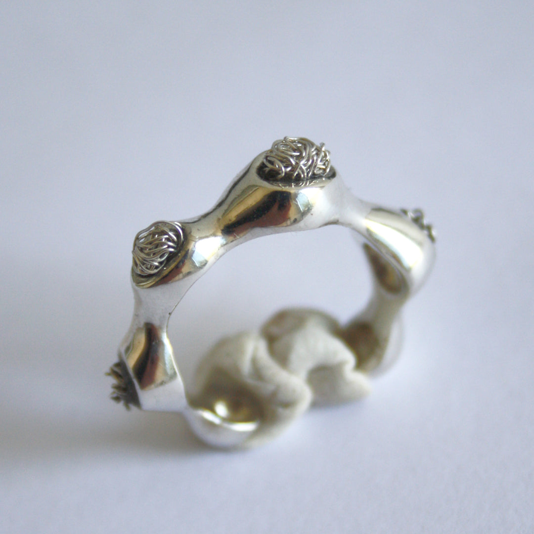 Este anel celebra a fluidez e a força natural da envolvência do mar, de formas ondulares e orgânicas que evocam o movimento da água e o traço intuitivo do desenho à mão. No topo de cada onda, surge um novelo em fio de prata, como pequenos botões de flor prestes a desabrochar.